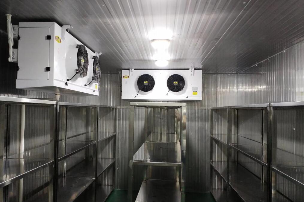 (2)1#和2#0-5°℃茶葉保鮮庫制冷系統配備的是2套10HP艾默生渦旋壓縮機組,該機組制冷量大,性價比高,安全可靠。冷庫內配備的是2臺凱迪DL-125系列高效強風型冷風機,該風機運行穩定噪音小,送風距離遠,使得庫內降溫速度快,極大增強了化霜效果,增加快速對流循環,從而達到每個角落的溫度均勻性。